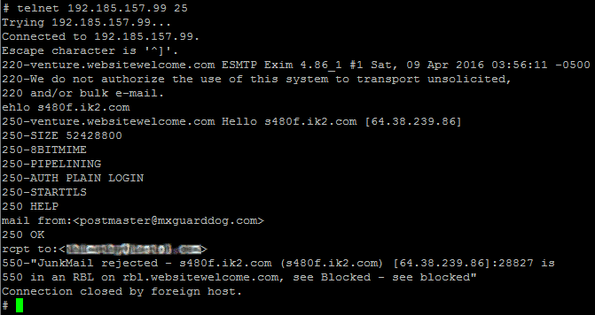 HostGator has not reached out to us, but our shared customers continue to contact the HostGator support channels and are getting their attention. HostGator support agent Jacob I. is requesting proof of the rejection in the form of headers from an undeliverable message. We can do better than that, here is a screenshot of a manual connection test so they can see the entire communication channel leading up to the rejection notice and disconnection by HostGator.